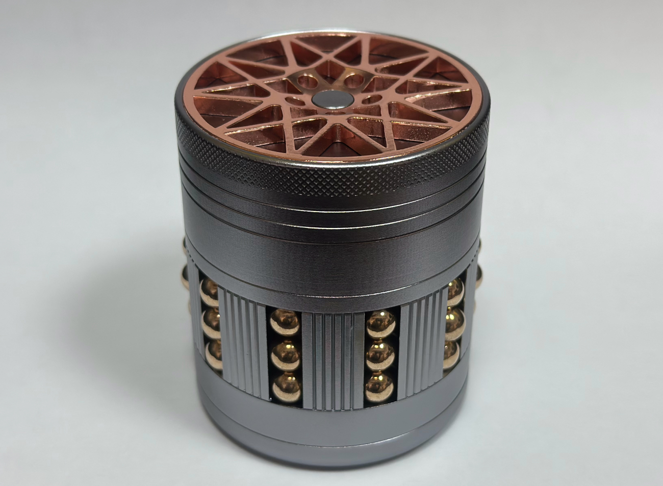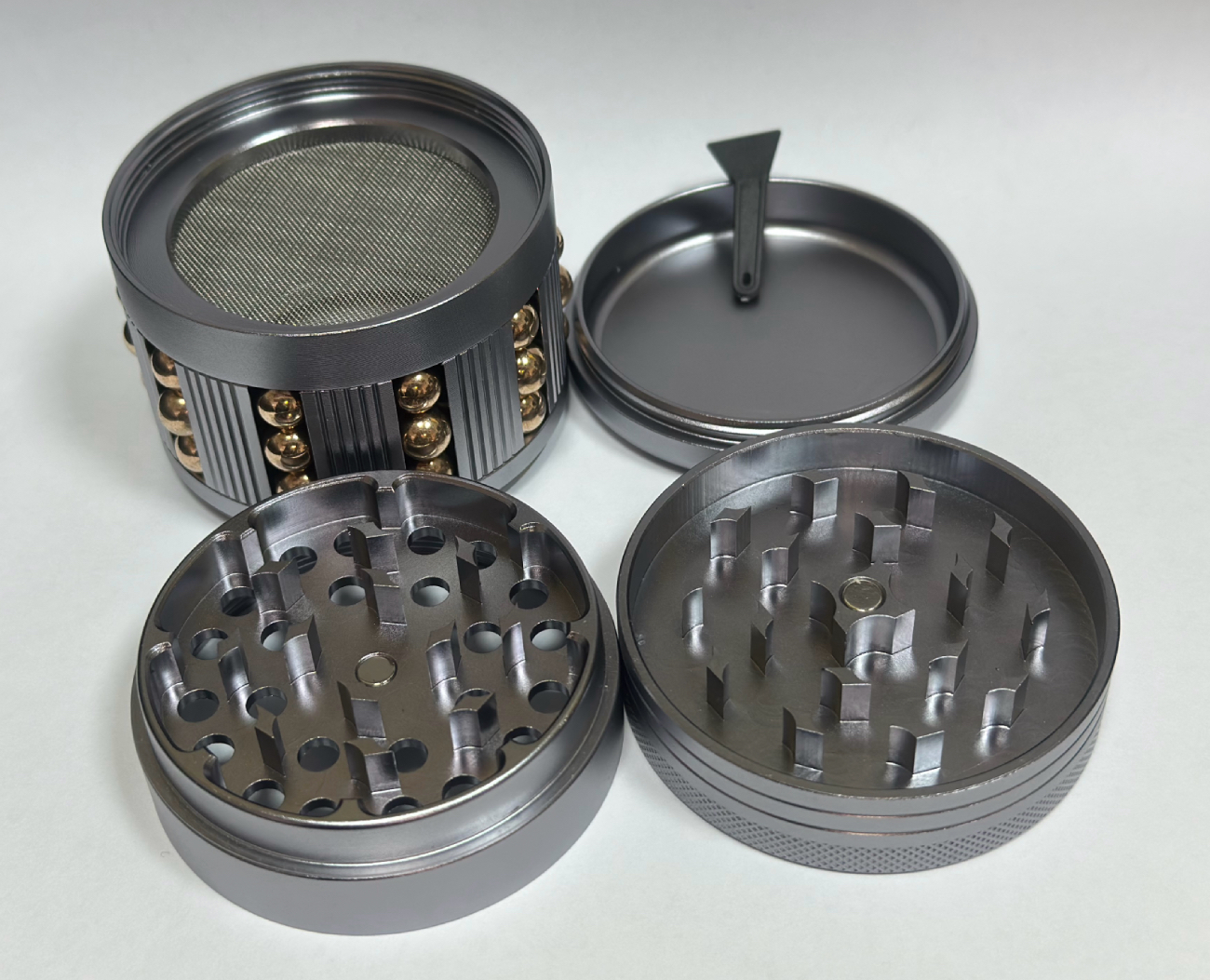 Masívna hliníková drtička zostavená zo štyroch častí. Prvé dve časti sa starajú o kvalitné podrvenie sušiny. Pod nimi sa nachádza obrovský priestor, kde je možné uložiť vaše bylinky a jemné sítko, ktoré prepustí peľ z rozdrveného rastlinného materiálu. Obal drtičky obsahuje kovové guličky, ktoré pri pohybe vytvárajú zvuk podobný perkusnéhmu hudobnému nástroju Afuche. Súčasťou drtičky je aj malá škrabka. V prípade potreby je možné časť so sítkom vyšróbovať a drtičku zobrať so sebou na výlet v zmenšenej verzii.