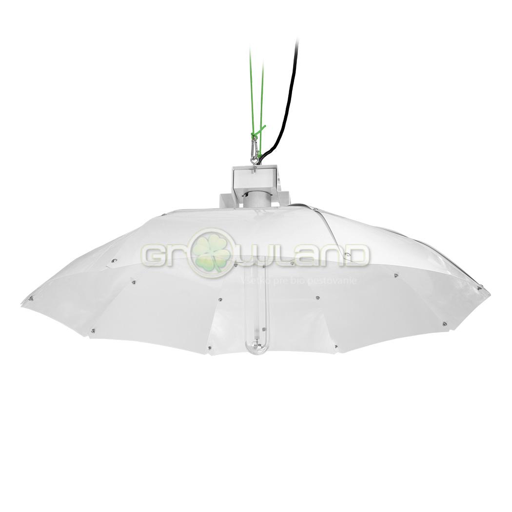 Biely vysokokvalitný reflektor Sun King v tvare paraboly pre metalhalidové a sodíkové výbojky. Určené pre 150, 250 a 400 Wattové výbojky. Tento parabolický reflektor sa skladá z jednotlivých panelov s ventilačnou hornou časťou, ktorá znížuje nahromadené teplo. Nezvyčajná vertikálna montáž lampy umožňuje odraziť viac svetla smerom k zariadeniu od zakrivených bielych panelov reflektora. To tiež vytvára rovnomernejšie rozloženie svetla a pomáha predchádzať nerovnomernému rastu rastlín. Dodáva sa s držiakom žiarovky E40 a vedením IEC. Tienidlo neobsahuje výbojku.