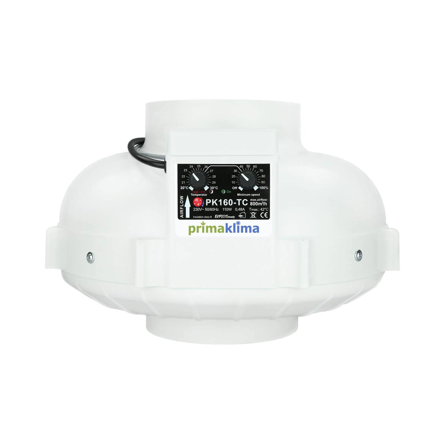Regulovať je možné aj minimálne - maximálne otáčky. Od 0 po 100 % výkonu ventilátora. Napríklad: pri pestovaných plodinách je pri 100 % výkone velmi chladno, ale rastliny sú náchylné na vysokú teplotu preto je vhodné znížiť otáčky motora na 50 % výkon a nastaviť max. možnú teplotu, ktorá je pri pestovaní nevyhnutná, napr. 25 C. Pri tomto modely bude ventilátor fungovať tak, že bude bežať na 50% výkon a akonáhle teplota v miestnosti vystúpy nad 25 C ventilátor sa automaticky zapne na 100 %. Akonáhle teplota v miestnosti opäť klesne pod 25 C, zariadenie zníži výkon ventilátora na polovicu.